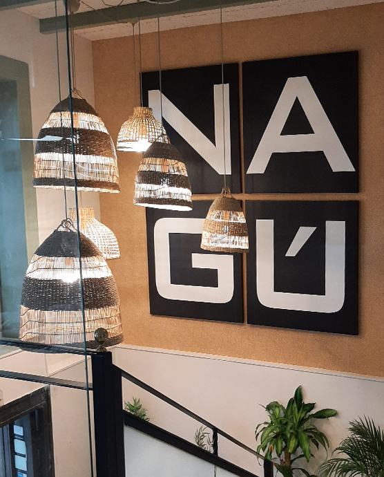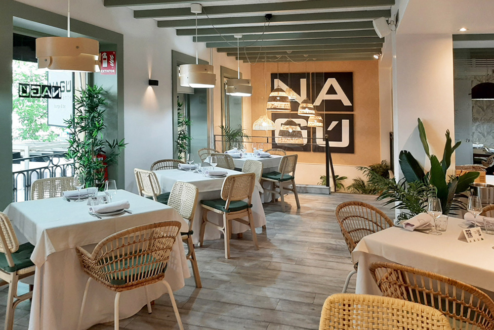 “Cada plato es cocinado con mimo preservando su sabor y la calidad del producto. Encontrarás platos de cuchara, carnes, ensaladas, pescados y postres caseros con aires mediterráneos. Te apasionarán las croquetas cremosas, los torreznos, la tortilla española jugosa, su maravillosa hamburguesa de angus, las vieiras gratinadas, el tartar, las alcachofas a la brasa, el carpaccio de gambas, la picaña de vaca vieja, su lubina… La oferta se completa con una interesante carta de vinos, con más de 20 referencias de las principales DO de origen españolas. Los diferentes ambientes del restaurante Nagú permiten disfrutar cualquier momento del día, ya sea con un almuerzo en su reservado, un tapeo en la barra, o una cena».